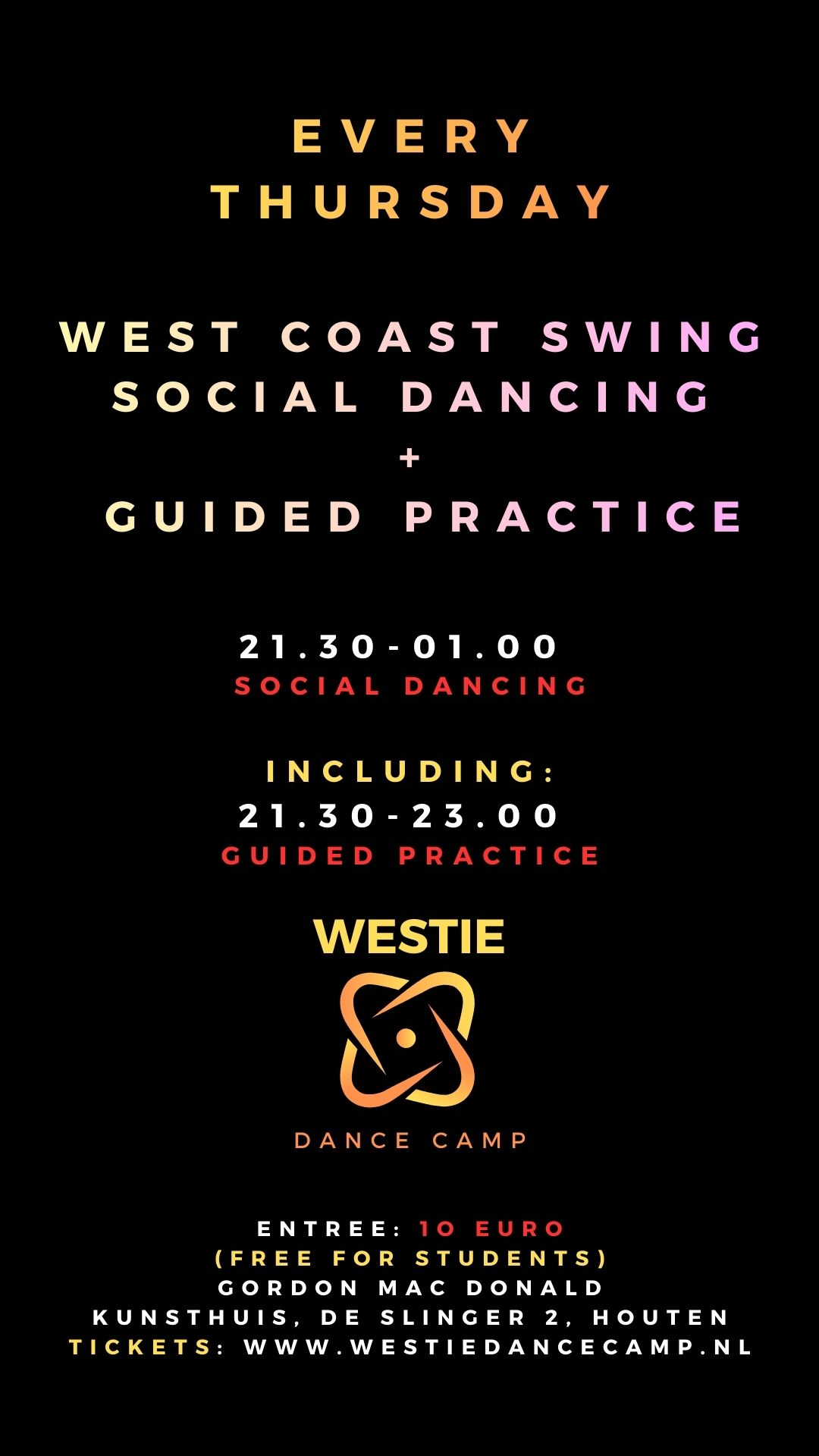 This class can be repeated until you’re ready to move on to more advanced concepts, as you will absorb different tips each time you go through it. Please ask the instructor for an assessment. This is also a great class to repeat throughout your WCS journey in order to keep improving your toolkit of technique.